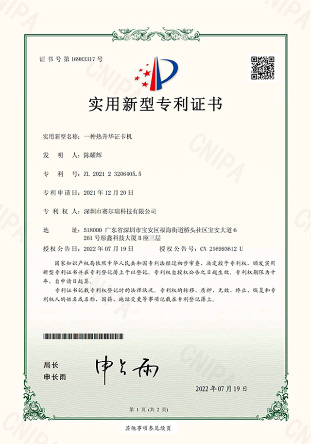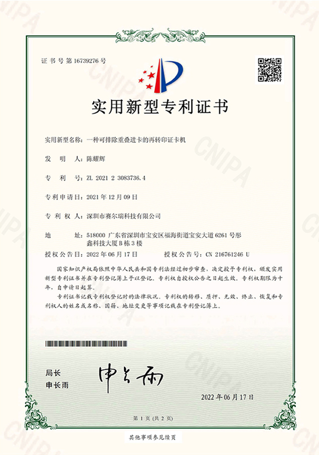 В условиях, когда в стране все больше внимания уделяется защите интеллектуальной собственности, компания Seaory продолжает совершать прорывы в разработке и проектировании принтеров для печати карт, внося большой вклад в развитие оригинальных базовых технологий. Недавно компания получила еще пять патентов на изобретения полезных моделей, разрешенных Национальным управлением интеллектуальной собственности.