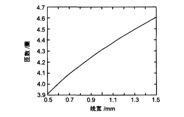 Assuming that the inductance is 1.6uH, the length of a wire loop is l1=16cm, and the end of the coil is square (K is 1.47), the relationship between the number of coil turns and the line width can be calculated. The line width is generally 0.5~1.5mm.